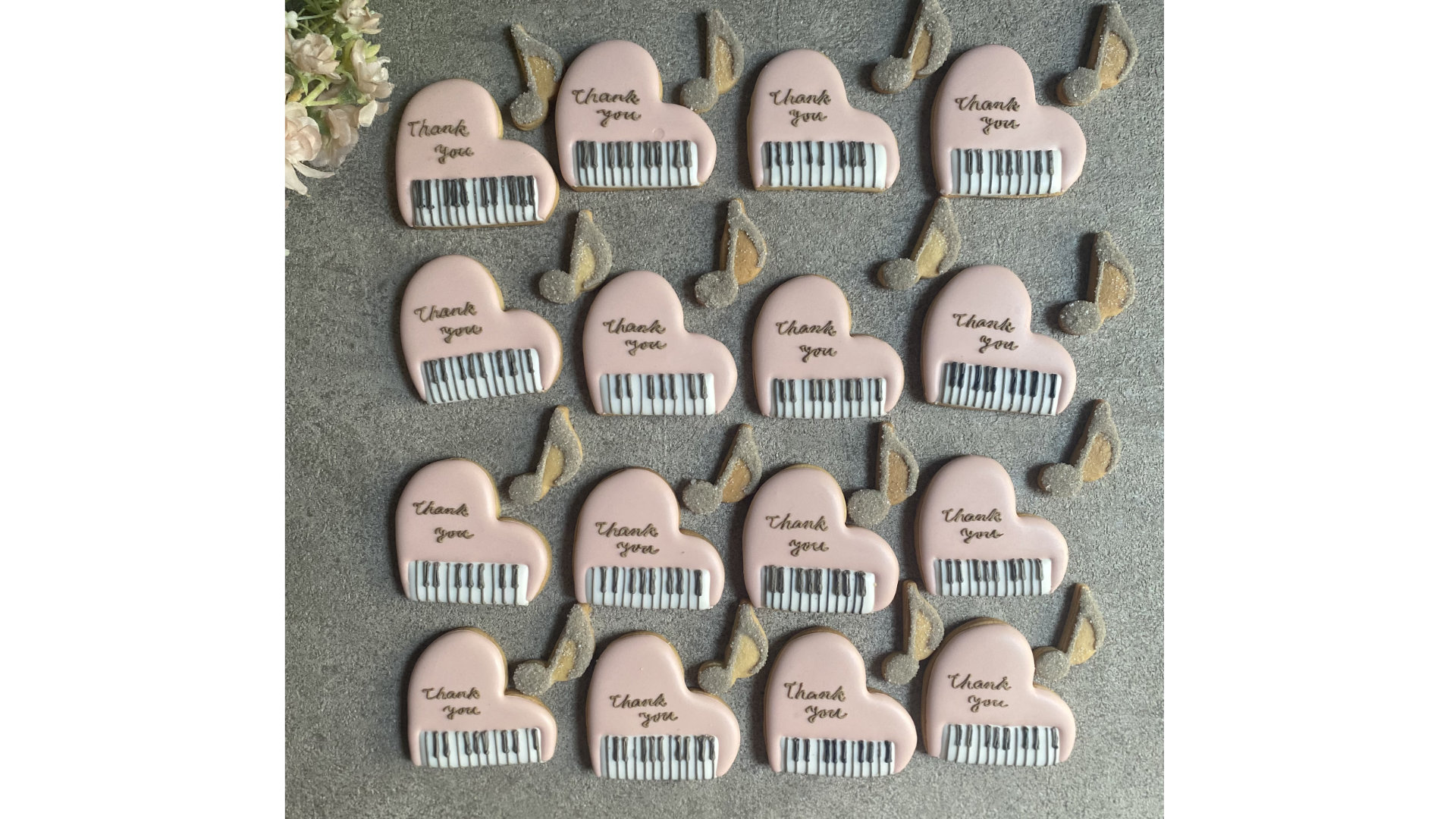 メインとなるクッキーは、可愛らしいピンク色をベースにしたハート型。そこに繊細なピアノの鍵盤を描き込み、「Thankyou」のメッセージを添えています。